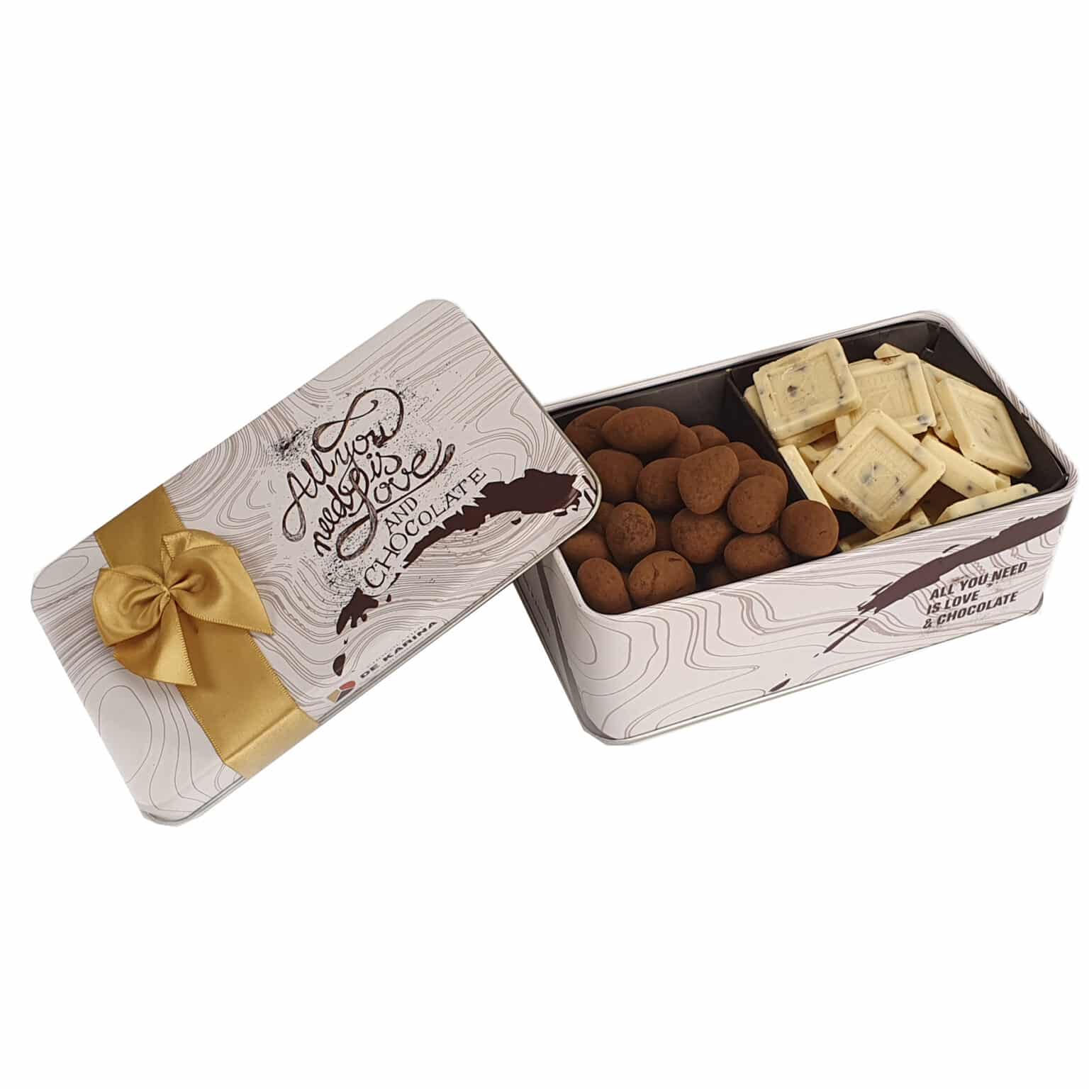 דואט לבן פורסם 31/10/2024 ב1772 × 1772 בדואט לבן – דה קרינה אריזת פח מהודרת עם ריבועי שוקול לבן ופולי קקאו ופניני שוקולד מריר שקד