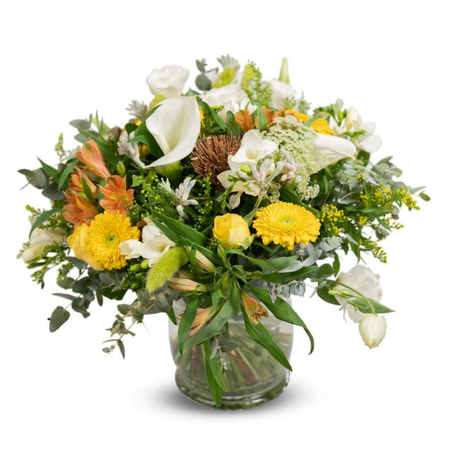 זר פרחים קייצי בגווני לבן כתום צהוב