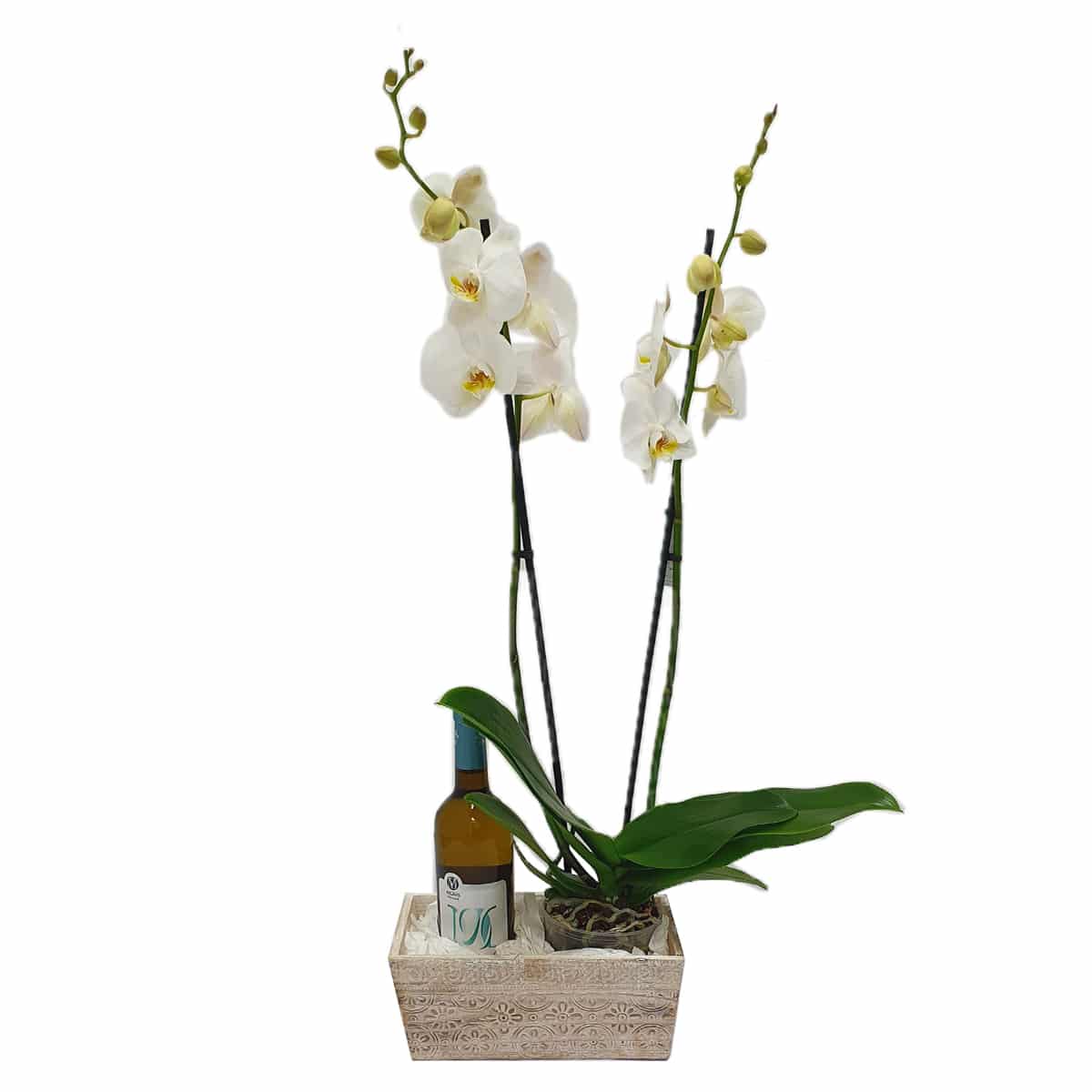 מארז המכיל צמח סחלב (שני ענפים) ובקבוק יין אדום מבית יקב מוני 750 מ”ל בתוך תיבת עץ או סלסלת קש נצרים.