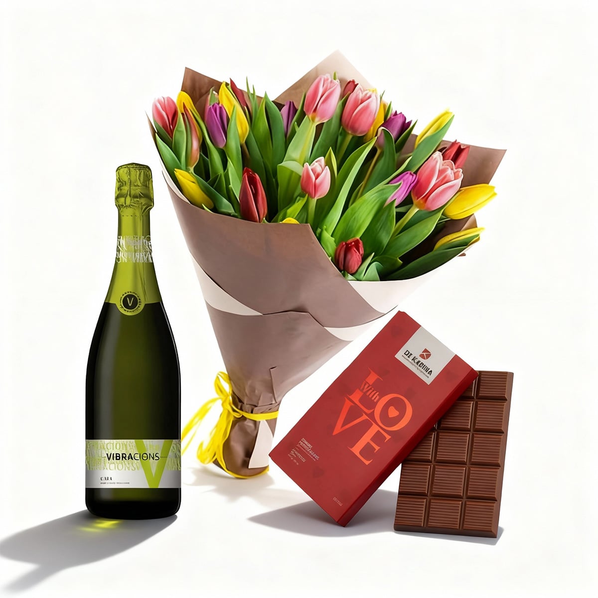 דיל משתלם במיוחד המכיל זר 15 פרחי טוליפים (צבעונים), בקבוק קאווה ויברסיונס וטבלת שוקולד חלב עם כרמל מלוח – דה קרינה